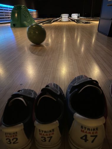 Auf knapp 7000m² haben wir die Qual der Wahl und entscheiden uns heute für Bowling. Schnell haben wir online unsere Zeit gebucht und los geht’s. Auf 10 Bahnen kann hier gebowlt werden. Für Kinder kann die Bande hochgestellt werden (geht automatisch) und eine Rollrampe benutzt werden, so dass auch kleine Kinder mitbowlen können.