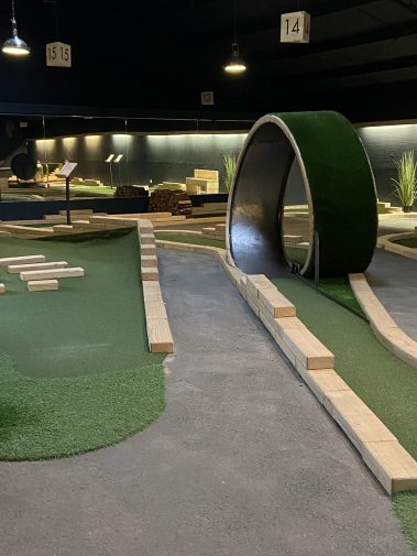 In der zweiten Etage gibt es den großen Indoor-Minigolfplatz – manche Bahnen sind wirklich super schwierig und durch das Holz nicht vergleichbar mit Minigolf draußen. Also, unbedingt auch mal probieren. Soccer-Plätzen