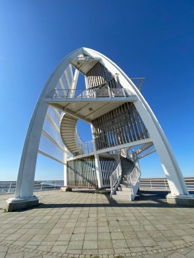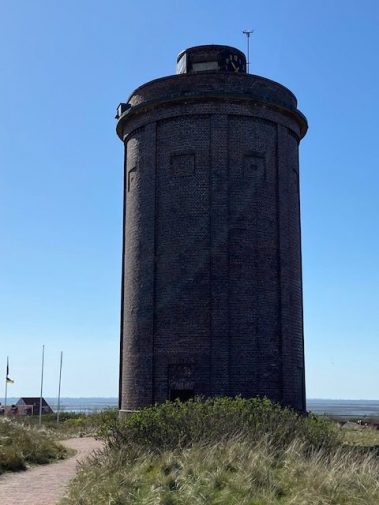 Danach laufen wir am breiten Sandstrand zurück und nehmen einen der vielen Zugänge zurück zu den Rädern. Hier entdecken wir auch den „Doornkaatbuddel“, den Wasserturm, der auf einer Düne über dem Ort steht und die Frischwasserversorgung sichert.