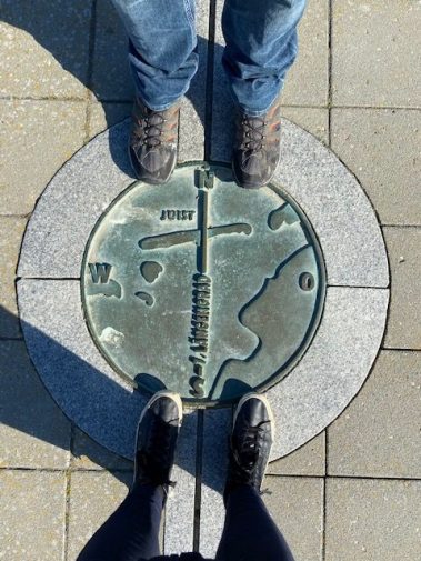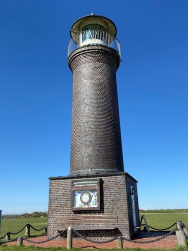 Wir radeln weiter in den Ort und es zieht uns zuerst an den Hafen, um das Wahrzeichen von Juist zu erklingen, das am Ende der Seebrücke steht. Auf dem Weg dorthin stolpern wir buchstäblich über die Markierung des Längengrades. Der Blick von oben auf den Ort, das Meer und die Küste ist großartig. Zurück im Hafen staunen wir über die vielen Transportboxen auf Rädern, über die Müllabfuhr per Pferd und bei Gesprächen mit den Einheimischen, was es bedeutet „autofrei“ zu leben. Hier erfahren wir auch, dass der Leuchtturm Memmertfeuer niemals in Richtung See, sondern nur ins Landesinnere leuchten darf und ursprünglich auf der Insel Memmert stand und hierher gerettet wurde. Vom Hafen ist es nur einen Katzensprung zum Ort, in dem es sehr touristisch zugeht, aber alles zu finden ist, was man benötigt. Wir stärken uns mit Fischbrötchen im Juister Fischkehuus und fahren dann weiter durch den Ortsteil Loog an den Hammersee.