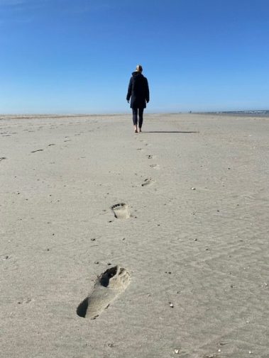 Weiter geht es an den Salzwiesen entlang und immer wieder kreuzen Wildgänse mit ihren Küken den Weg 😊 Am letzten fahrradparkplatz der Insel lassen wir die Räder stehen und laufen den Sandweg mit Blick auf die Vogelinsel Memmert zum Billriff. Wir sind sofort verzaubert, denn es ist kaum jemand hier und wir können die Ruhe, das Meer, die Dünen, den Wind und der schier endlose Sandstrand genießen. Wir laufen einige Kilometer bis an die Westspitze von Juist – auf dem Hinweg in der kalten Nordseebrandung, auf dem Rückweg auf dem warmen Sand. Mit etwas Glück sieht man hier sogar Seehunde, aber auch ohne ist es wunderschön. Ein Bild und kaum Worte können dieses Gefühl beschreiben – man muss es selbst erleben 😊