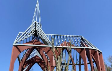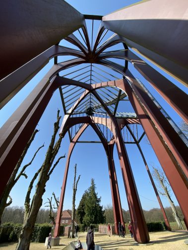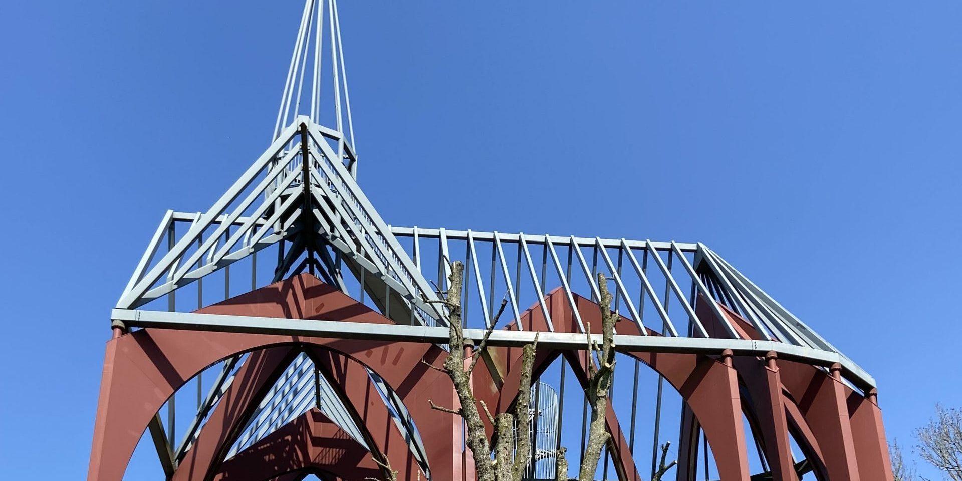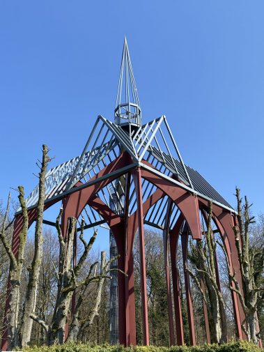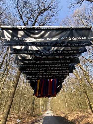 Wir parken direkt auf dem Waldparkplatz und laufen entspannt den Waldweg entlang. Nach etwa 1,5 km erblicken wir auf einer Lichtung das futuristische Kirchengerüst der Klosterstätte Ihlow.
