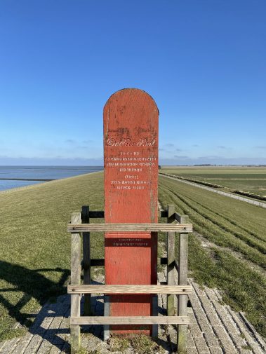 Von hier aus läuft man ca. 7,5 km hinter dem Deich den geraden Weg bis nach Norddeich – vorbei am Flughafen Norddeich, Waloseum bis hin zur Vogelbeobachtungsstation in Norddeich. Der Blick geht immer wieder in die wunderschöne ostfriesische Landschaft oder auf den Deich mit den Schafen. In etwa der Mitte des Weges wartet der Rote Pfahl als Grenzpfahl und Längenmaß und erinnert an alte Zeiten.