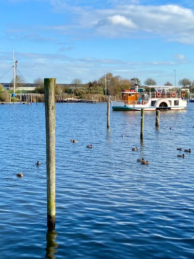 Wir müssen nur aufpassen, denn wir dürfen unseren Rücktransport nicht verpassen. Denn vom Museumshafen in Carolinensiel zurück an die Schleuse in Harlesiel gegenüber dem Parkplatz fahren wir mit einem Schaufelraddampfer (Fahrplan | Raddampfer CONCORDIA II (raddampfer-concordia.de)). Es ist großartig die gleiche Strecke mit dem Schiff zu fahren 🙂