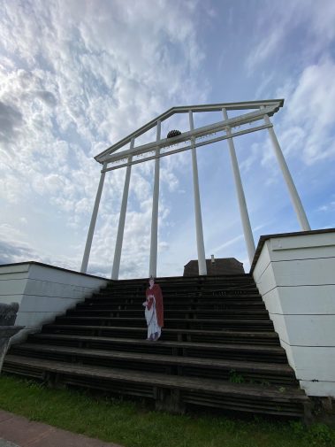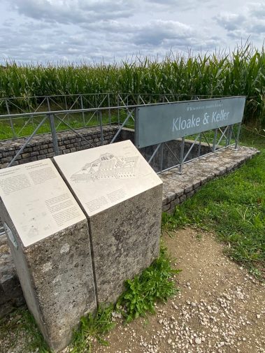 Von dort geht es über das Feld zum Forum. Heute stehen hier keine Ruinen mehr, aber durch eine große Tempelfassade, die auf dem Feld errichtet ist, kann man die Dimension des Forums gut erahnen. Überall gibt es Infotafeln und Ferngläser, die Bilder zeigen, wie es damals ausgesehen hat – ein fast buchstäblicher Blick in die Vergangenheit. Zwischen den Stationen entdecken wir kleine Details, die das Leben der Römer greifbar machen: Gewerbehäuser, eine Backstube oder kleine Tempel. Die Kinder staunen, wie vielseitig das römische Stadtleben war.