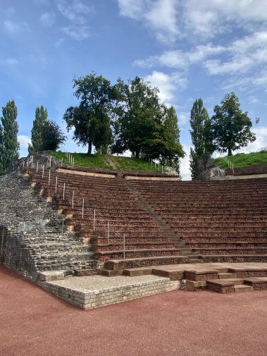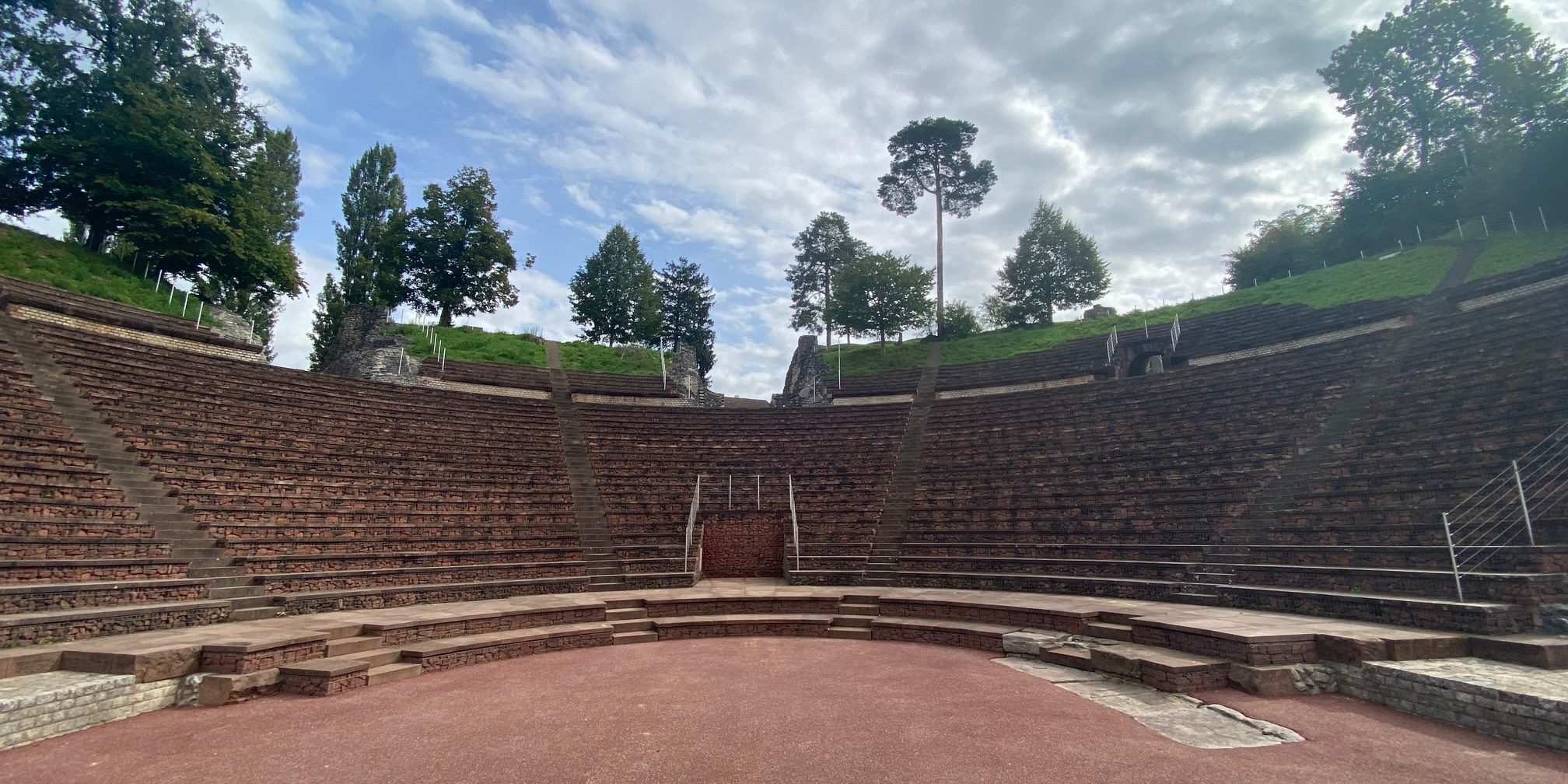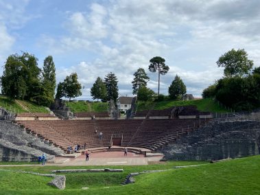 Nach etwa zehn Minuten gelangen wir zum Amphitheater. Auf dem Weg dorthin erfahren wir alles über das Leben der Gladiatoren und ihre Trainingsmethoden. Das Amphitheater selbst beeindruckt durch seine Größe – man kann sich richtig vorstellen, wie hier Kämpfe oder Theateraufführungen stattfanden. Ein kurzer Abstecher führt uns noch zum Heiligtum in der Grienmatt, bevor wir wieder Richtung Theater/Museum laufen.