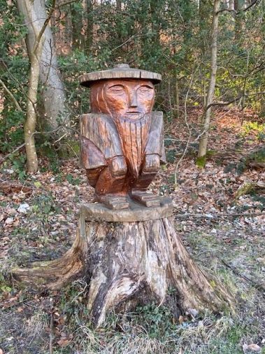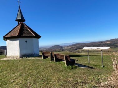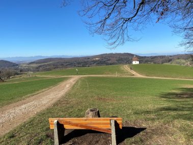 In Sölden steigt der Pfad weiter ab und vom Wanderparkplatz (hier kann man auch in den Pfad einsteigen) laufen wir am Waldrand entlang bis auf den Saalenberg. Die kleine Kapelle verzaubert uns – genau wie auch der Ausblick auf den gegenüberliegenden Berghäuser Matten und die Rheinebene. Zwei Bänke laden uns erstmal zum Picknick ein, während die Kinder den Sagenpfad am Waldrand dahinter entdecken. Hier sind diverse Spiele aus Materialien des Waldes angeboten wie auch Holzfiguren der unterschiedlichsten Sagen. Eine entspannte Pause, denn wir haben einen kleinen Anstieg vor uns bevor der Weg durch den Wald, über kleine Holzbrücken und an übergroßen Vogeltafeln und Holzstühlen weiter in Richtung Bollschweil führt.