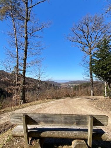 Wir parken in Au und steigen Richtung Kurklinik hinauf und können uns beim Tiersuchspiel von der kleinen Anstrengung ablenken. Durch Wiesen und Wälder, vorbei an Mühlrädern führt der Weg zum höchsten Punkt der Tour. Der Ausblick bis nach Freiburg ist wunderschön.