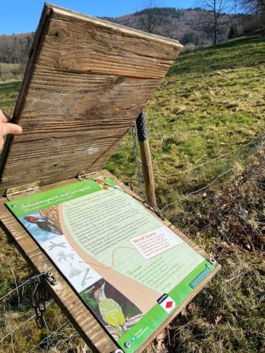 Im Tal angekommen schlängelt sich der Weg kurz an der Landstraße entlang und danach darüber. Anschließend spazieren wir durch das wunderschöne Möhlintal bis nach Bollschweil. Auf dieser Strecke finden sich immer wieder Holztafeln zum Aufklappen, die Wissenswertes über die heimische Vogelwelt erklären. Dazu gibt es auch ein nettes Quiz, das Jung und Alt gleichermaßen Spaß macht: VogellehrpfadFlyer_Kinder_23.03.2013.pdf