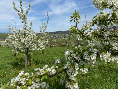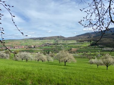 Ein ganzes Tal voller Kirschblüten finden wir im Eggenertal im Markgräfler Land rund um Obereggenen zwischen Schliengen und Kandern. Hier blühen im April und Mai hunderte Obstbäume unterhalb des Hochblauen am Fuße des Südschwarzwaldes.