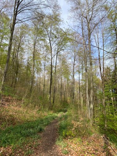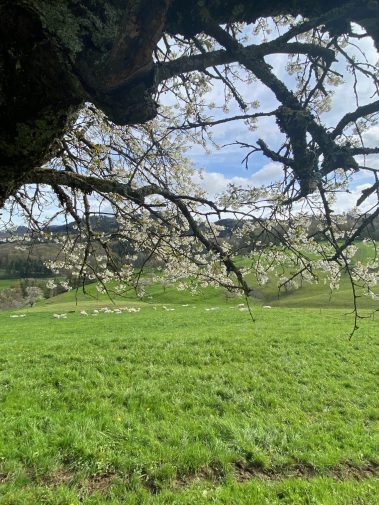 Als wir aus dem Wald treten, erwartet uns eine wunderschöne Bank, die wir gleich für ein Picknick nutzen bevor wir weiter zum Wanderparkplatz Stelli laufen. Von hier aus nutzen wir den Obstlehrpfad, der sich zwischen den blühenden Kirschbäumen schlängelt. Vorne die weißen Blüten, das Summen der Bienen im Ohr und die grünen Hügel und Berg des Südschwarzwaldes im Hintergrund, ist das Spazieren durch das Eggenertal Entschleunigung pur.