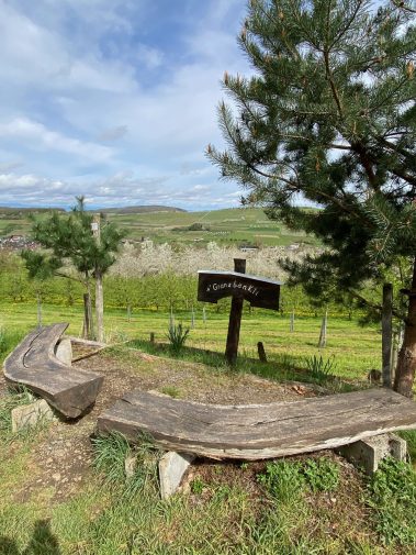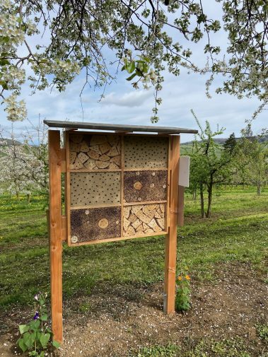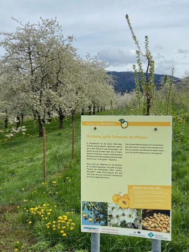 Immer wieder finden wir Bänke am Wegesrand, die uns einladen, das Panorama zu genießen und die Seele baumeln zu lassen. Auf den Informationstafel zwischen den Obstbaumwiesen lernen wir zudem auch noch viel Neues über die Sorten, Anbauweisen und Insekten.