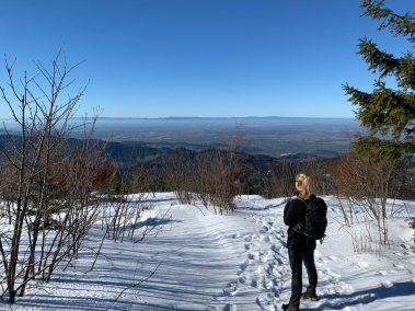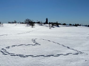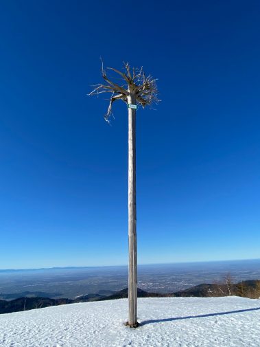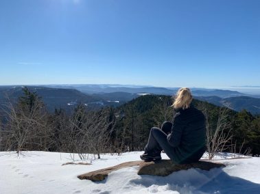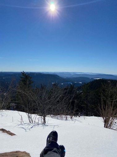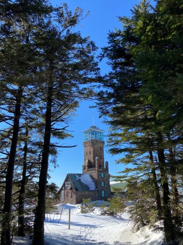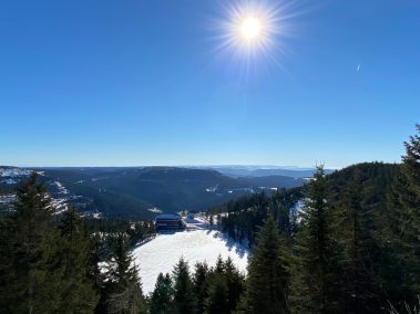Nach der Stärkung laufen wir zum Bismarckturm und genießen das Panorama vom Turm aus auf den Schwarzwald. Leider ist der Holzbohlenweg wie auch das Hochmoor komplett verschneit, was jedoch atemberaubend schön ist.