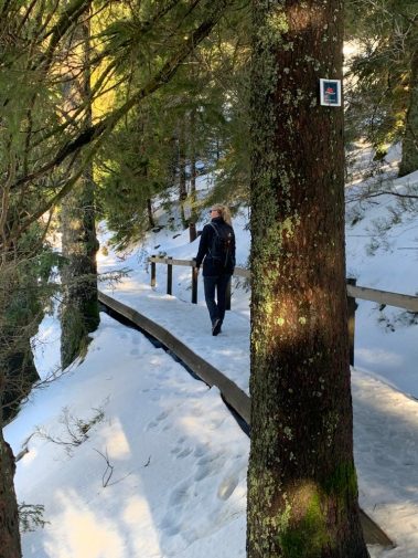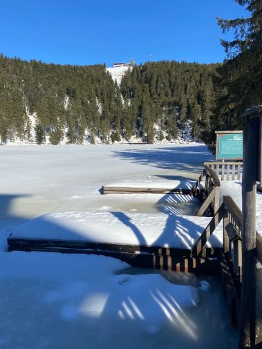 Wir genießen den ersten Blick auf den verschneiten Mummelsee und sind überrascht, wie klein dieser ist. Der Bootsverleih ist logischerweise geschlossen und der Spielplatz komplett eingeschneit, so dass wir den Schildern um den See folgen.