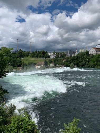 An der Eisenbahnbrücke läuft man in der Regel rechts auf die Nordseite. Unterhalb schießen die Wassermassen durch und es ist atemberaubend. Auf der anderen Seite führt ein Weg zu Aussichtsplattformen und von hier hat man einen spektakulären Blick auf den Rheinfall. Die Fälle sind 150 m hoch und es fließen bis zu 600.000 Liter Wasser pro Sekunde(!) hier herunter.