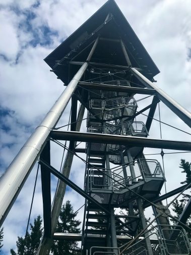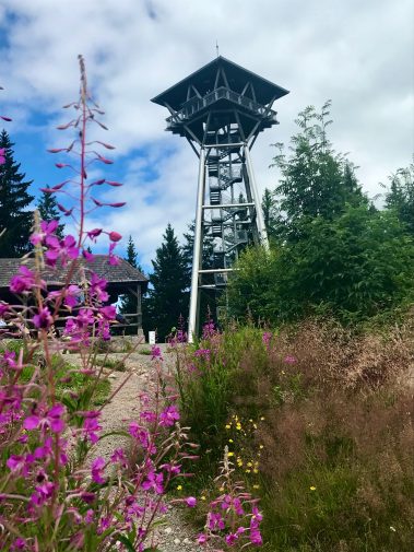 Oben laden Picknicktische, die Baumannhütte (keine Gastronomie) und große, teilweise drehbare Himmelsliegen zu einer Pause ein, bevor wir 25 Meter in die Höhe steigen. Die luftige Panoramaplattform des Riesenbühlturm bietet einen atemberaubenden Ausblick über den Schluchsee, Schwarzwald und bei gutem Wetter bis hin zu den Alpen.