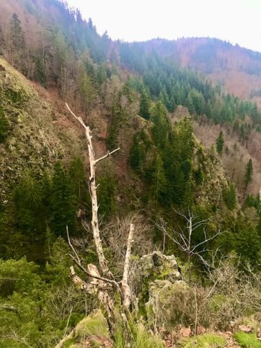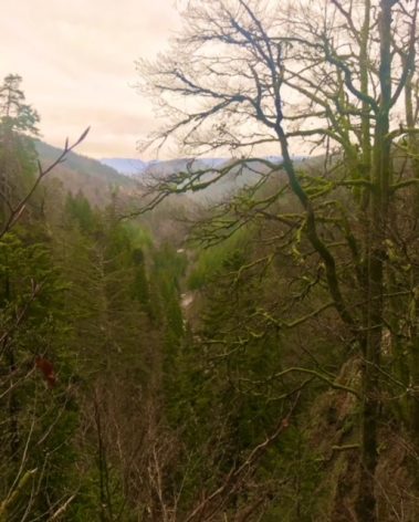 Nach etwa 20 Minuten Wandern über Stock und Stein durch den Wald erreichen wir die Engelskanzel, von der wir einen atemberaubenden Blick über den Schwarzwald haben. Auf diesem Streckenabschnitt finden sich immer wieder Tafeln, auf denen die Sagen der umliegenden Bäume und Felsen erklärt sind – höchst amüsant 😉