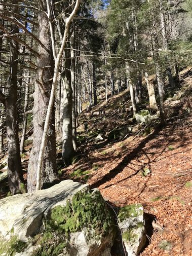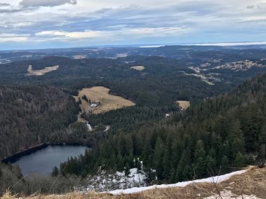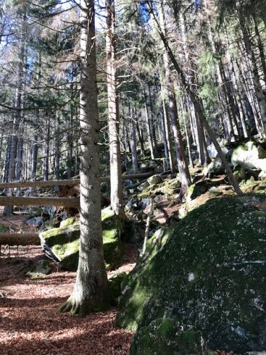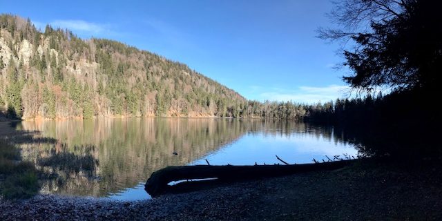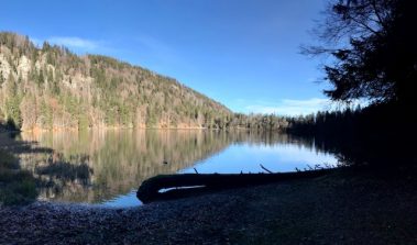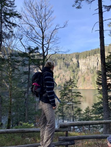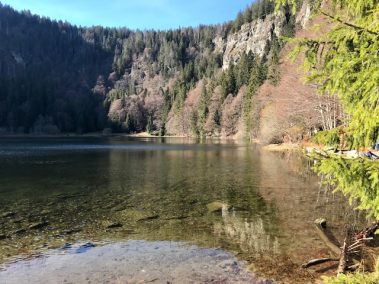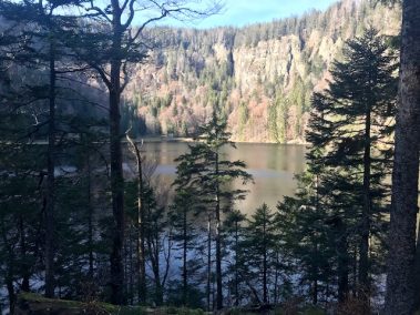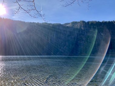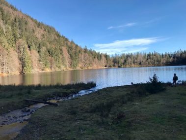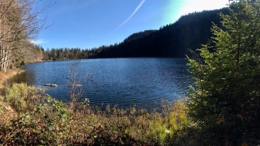 Steil geht der Weg bergab über Stock und Stein und an vielen Orte versteht man, warum der Schwarzwald, Schwarzwald heißt. Wir sind den Weg im Sommer und Herbst gelaufen und jedes Mal erstaunt uns dies. Hier tauchen wir in den Wald ein bis wir unten angelangt sind und durch die Bäume schon den See erahnen können.