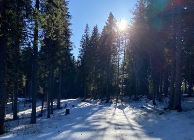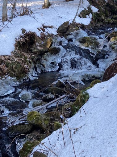 Unsere Tour beginnt am Parkplatz des Wasenlifts in Muggenbrunn. Von dort aus steigen wir gemächlich in den winterlichen Wald auf und genießen den plätschernden Bach, der teilweis gefroren ist. An der zweiten Weggabelung nehmen den rechten Pfad weiter am Trudelsbach entlang durch die verschneite Winterlandschaft.