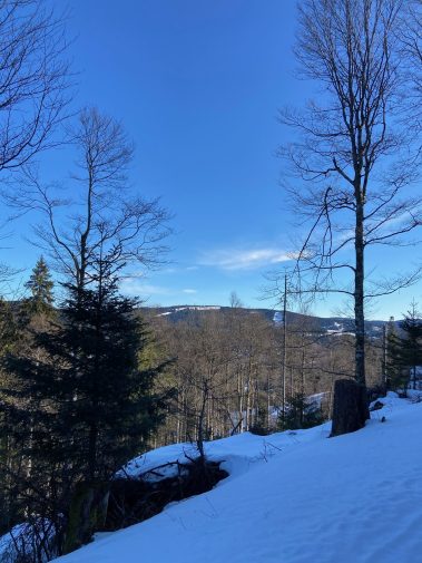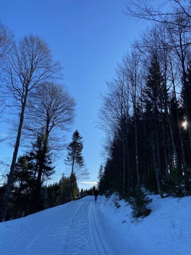 An der nächsten Abzweigung folgen wir dem Winterwanderschild und steigen den Berg hinauf und laufen dann mit herrlichem Blick auf den Feldberg weiter durch den Wald. Etwas später überqueren wir die Skipiste des Franzosenberges, um dann durch den Wald etwas weiter unten den Weg oberhalb von Muggenbrunn nehmen. Von hier aus haben wir wieder traumhafte Ausblicke auf den Schwarzwald.