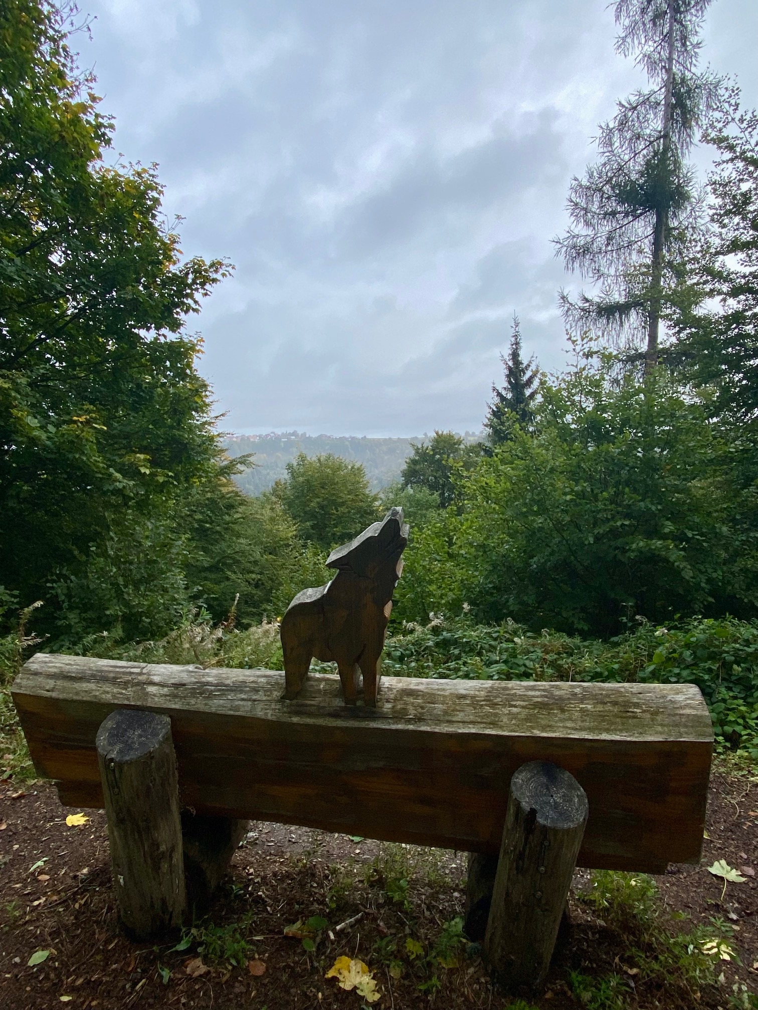 Unterwegs hat man immer wieder beeindruckende Aussichtspunkte über den Schwarzwald. Auf den Rastbänken, oft mit geschnitzten Wölfen, lässt es sich herrlich pausieren – perfekt für kleine Pausen und dafür, die Natur zu genießen.