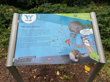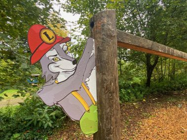 Der Weg ist etwa 3,9 km lang und sehr gut ausgeschildert. Man geht komplett auf naturnahen, schattigen Forstpfaden – ideal auch bei wärmerem Wetter. Der freundliche Wolf „Lupus“ begleitet euch wortwörtlich als Maskottchen: Er heißt euch am Start willkommen, erklärt, was euch erwartet, und zeigt, wie die Kugel am besten eingesetzt wird.