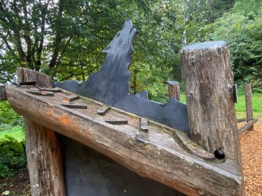 Ein weiteres Highlight auf dem Rückweg: Wir entdeckten rechts und links des Pfades Wolfsfiguren, die im Wald versteckt sind, und versuchten, sie zu finden – das hat den Kindern riesig Spaß gemacht. Fast am Ende wartet eine liebevoll gestaltete Picknickhütte mit Wolfs-Märchenecke, Tischen, auf denen ein typisches Wolfsabendessen illustriert ist, und einer großartigen Aussicht. Dazu stehen Bio-Toiletten bereit – sehr praktisch. Bevor wir den Rückweg antreten, müssen die Kinder unter Drähten entlanglaufen: Nur wer leise ist, lässt die kleine Glöckchenklingel der Seile nicht ertönen.