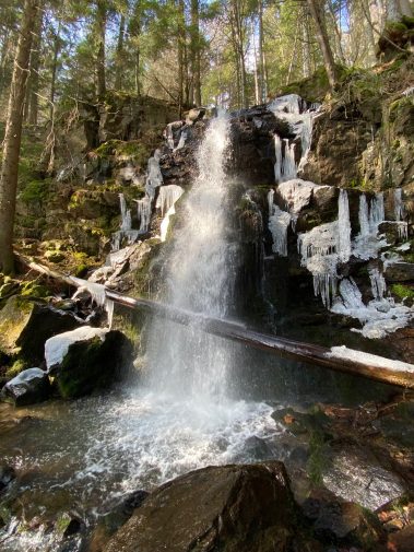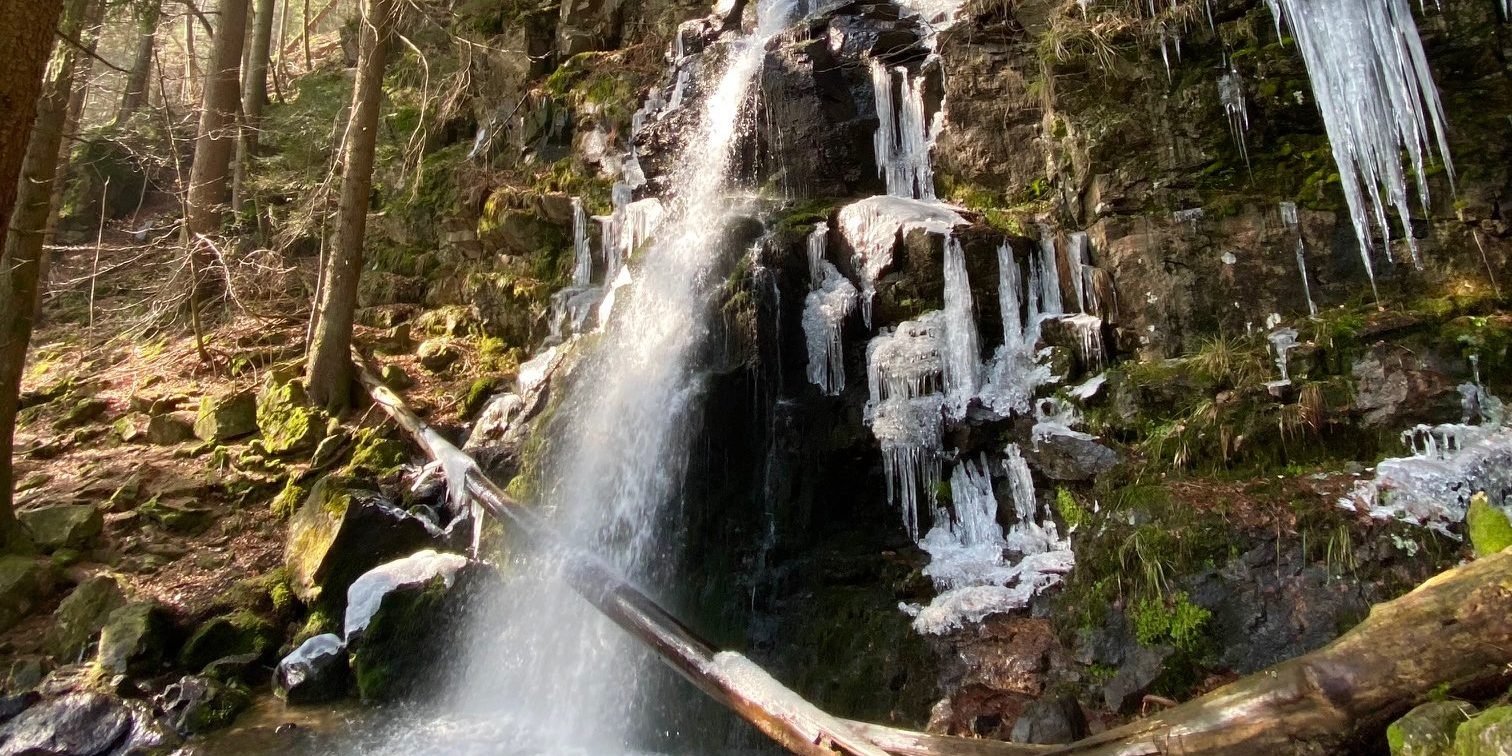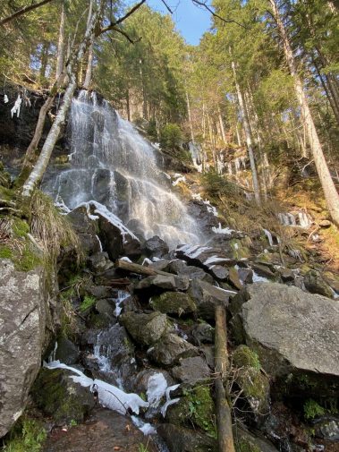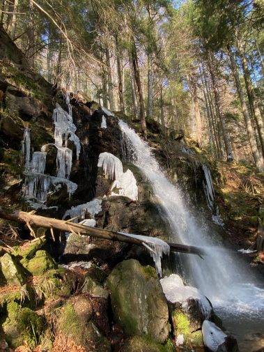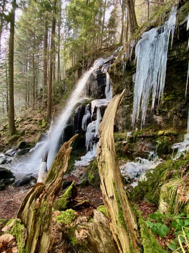 Nach etwa 1.8 Kilometern hören wir schon die Wassermassen und stehen kurze Zeit später vor den Zweribach-Wasserfällen, die für uns jetzt schon zu den schönstens im ganzen Schwarzwald gehören. In zwei Etappen stürzt sich das Wasser ins Tal – ein außerordentliches Naturschauspiel v.a. gerade jetzt, da noch ein Teil gefroren ist.