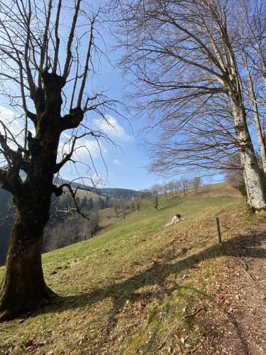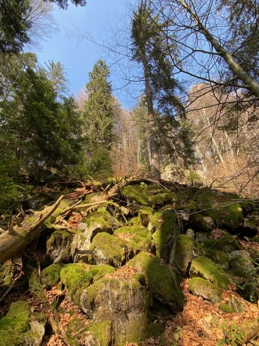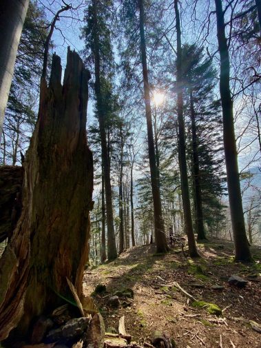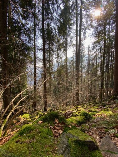 Danach geht der Weg etwa 160 Höhenmeter hinunter und wird immer enger. Es ist ein schmaler Pfad, bei dem Trittsicherheit gefragt ist und der links steil bergab geht. Aber der sogenannte Bannwald ist wunderschön und ein Naturschutzgebiet, denn es handelt sich um naturbelassenen Wald, der nicht von Förstern gepflegt sondern sich selbst überlassen wird. Umgestürzte Bäume, vermooste Steine wie auch übereinander wachsende Pflanzen zieren den Weg – und das wörtlich! Aber genau das macht diesen Weg so eindrucksvoll.