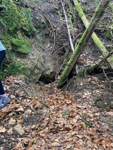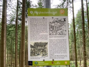 Heute zeugen noch richtig viele Spuren von dieser Zeit: eingestürzte Stollen, die als große Trichter im Boden zu sehen sind, drei offen gebliebene Schächte (natürlich gesichert!), die besonders beeindruckend ist. Überall stehen Infotafeln mit Erklärungen.