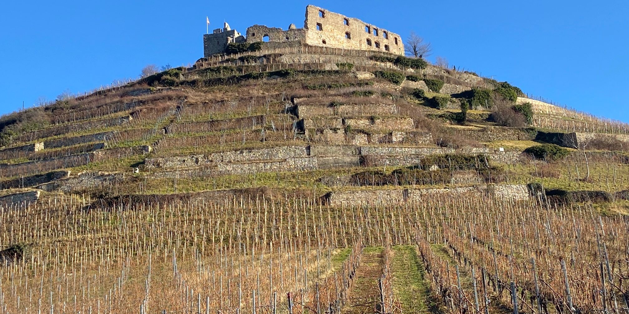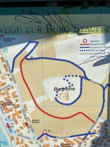 Auf der Himmelsliege rechterhand der Burg genießen wir einen kleinen Snack bevor wir wieder nach Staufen auf dem direkten geteerten Weg zurücklaufen.