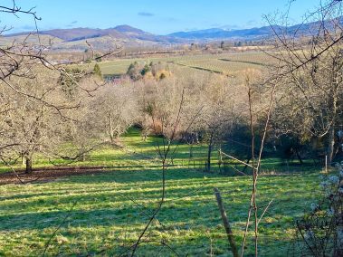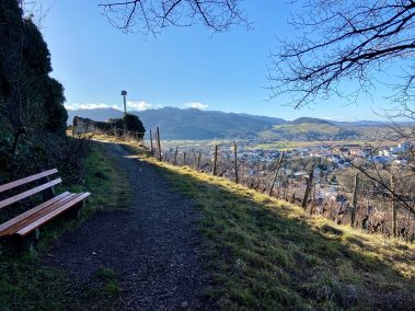 Gegenüber dem Parkplatz 15 geht einer der Wege hinauf zur Burg und wir folgen an der Abzweigung dem Panoramapfad, der links am Südhang entlang führt. Hier eröffnen sich herrliche Blicke auf die Berge des Schwarzwaldes, der Vogesen und des Kaiserstuhls.