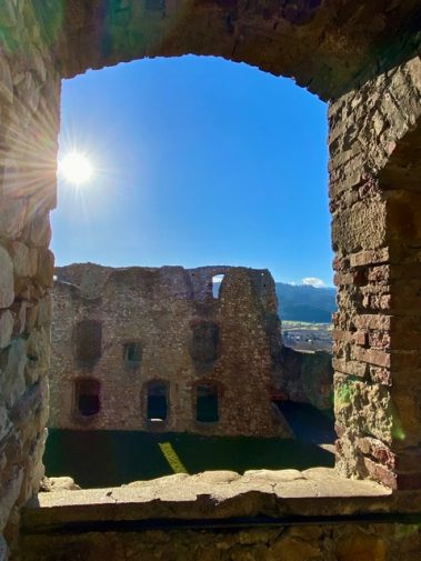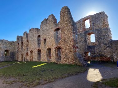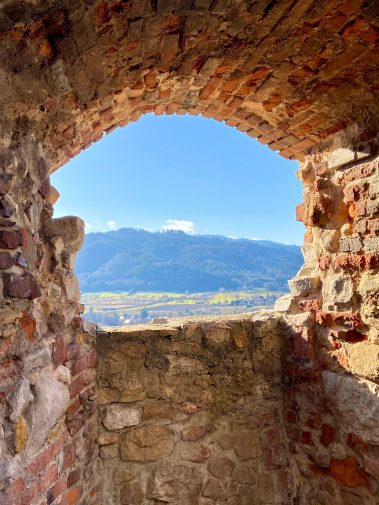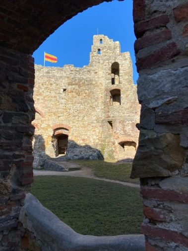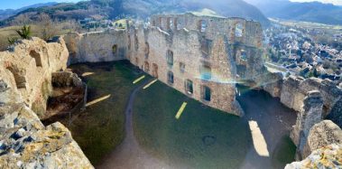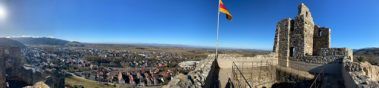 Unterhalb des Burgeingangs hat man einen traumhaften Blick über die komplette Rheinebene. Dann erkunden wir die Burg und überall kann geklettert, erkundet und entdeckt werden. Besonderes Highlight ist der Turm, von dem man einen grandiosen Ausblick auf Staufen, den Schwarzwald bis hin zu den Vogesen hat.