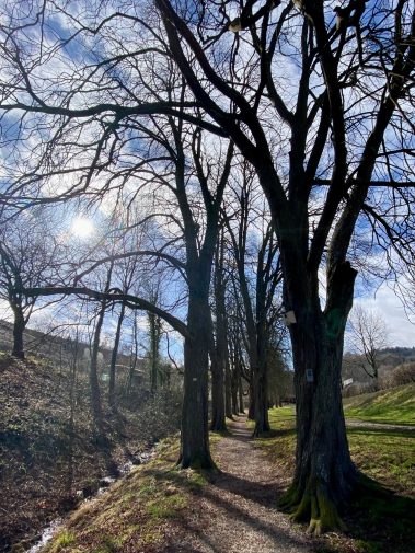 Uns bleibt heute nur, den Weiher zu umrunden und über die kleine Brücke am Naturweiher immer am Stückgraben weiter in Richtung Weinberge zu laufen. Der Weg führt durch eine Kastanienallee durch das Naturschutzgebiet Erletal bis zum Waldrand. Eigentlich müssten wir hier rechts in den Wald abbiegen, aber wir wollen unbedingt noch durch das Erleloch laufen.
