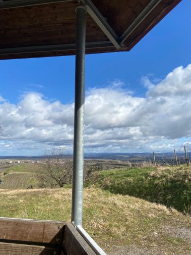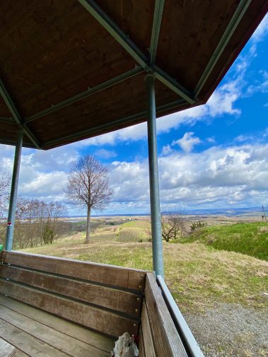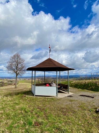 Wir laufen wieder das Stück zurück und nun schlängelt sich der Weg durch die Weinberge nach oben. Der Pavillon der Winzergenossenschaft Endingen ist der perfekte Picknickplatz und beim Ausblick über die Weinberge und den Schwarzwald schmeckt es doppelt so gut.