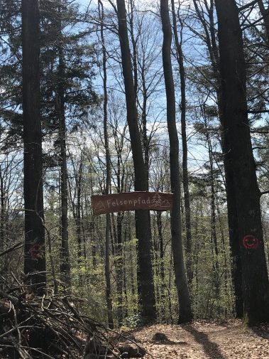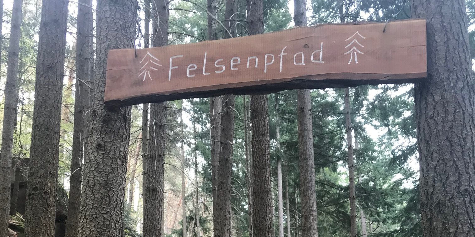 Wir parken gegenüber der Hammerschmiede und laufen zuerst den breiten Waldweg entlang. Der Weg ist gut ausgeschildert, trotzdem fragen wir uns schon, was sich hier Felsenpfad nennt. Doch plötzlich taucht im Wald zwischen den Bäumen das Holzschild auf, das den Einstieg in den Felsenpfad markiert.