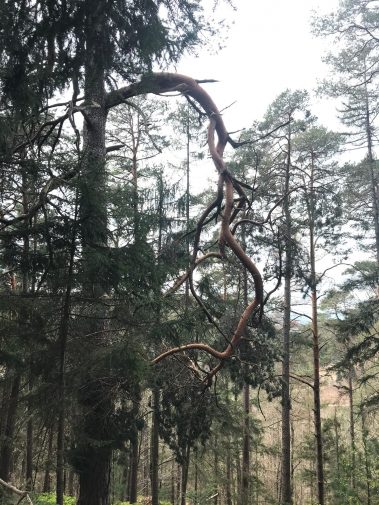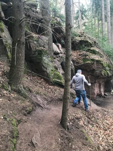 Von hier aus geht es steil über Stock und Stein den Berg hinauf – teilweise müssen wir auch Seile nutzen, um überhaupt hoch zu kommen. Wir steigen über große Felsen, drücken uns unter dicken Wurzeln hindurch und schlängeln uns den Pfad entlang. Daher ist der Pfad auch eher für ältere und trittsichere Kinder geeignet und eher bei trockenem Wetter zu empfehlen, aber dann ist es eine große Freude für Jung und Alt.