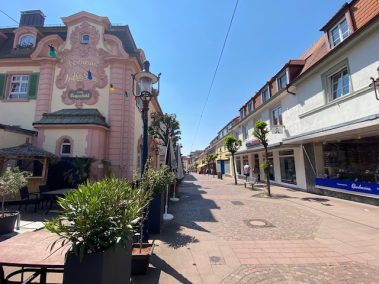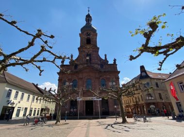 Von hier aus biegen wir rechts in die Lyzeumstraße ab, mit einen kurzen Abstecher zur Städtischen Galerie Fruchthalle und dem Pfefferbrunnen, die sich auf einem schönen Platz befindet. Kurz danach stehen wir vor der Bernhardus-Kirche. Sie ist die älteste Kirche in Rastatt und demselben heiliggesprochenen Markgrafen gewidmet, wie der Brunnen 😊. Innen ist sie aufwendig verziert und das Deckengemälde, das CCCC darstellt, beeindruckt. Auch der kleine Friedhof erzählt von der Geschichte Rastatts. Hier ruhen wir uns ein wenig aus, bevor wir an historischen Gebäuden wie das Kulturforum und die evangelische Kirche vorbeischlendern.