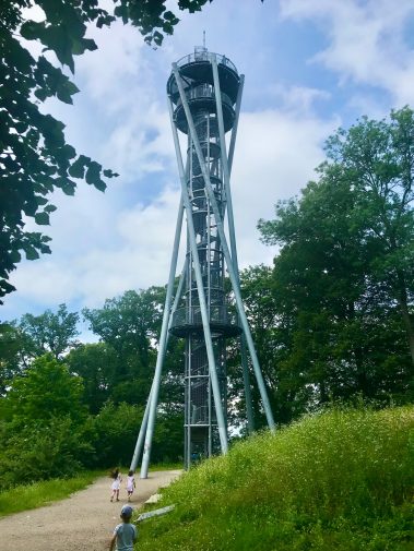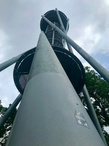 Neben Metall wird der Turm durch Baumstämme gestürzt, die nach dem Sturm Lothar vor Jahren gefällt wurden. Von oben hat man einem atemberaubenden Panoramablick auf Freiburg, den Schwarzwald und die Vogesen.