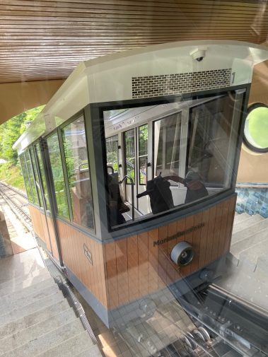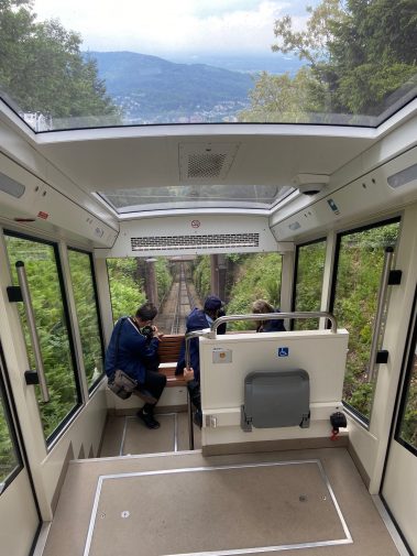 Nur etwa zehn Autominuten vom Stadtzentrum Baden-Badens entfernt liegt der Merkurberg, der Hausberg der Stadt. Mit der Merkurbahn, der steilsten Standseilbahn Deutschlands, geht es in wenigen Minuten fast 370 Höhenmeter nach oben. Die Fahrt ist automatisch, aber absolut sicher – und ein echtes Abenteuer.