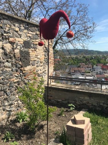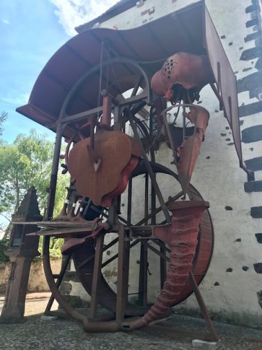 Kurz danach stehen wir vor dem Radbrunnenturm. Im Mittelalter diente er als Rathaus und Gefängnis wie auch als Trinkwasserbrunnen – heute beherbergt er Ausstellungsräume. Das spannende verbirgt sich auf der Rückseite des Turms, denn hier steht ein bizarres Kunstwerk von Helmut Lutz, der aus Breisach stammt und es lange dauert, bis wir mit Staunen und Entdecken fertig ist.