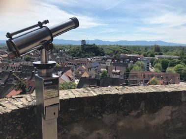 Wir starten unsere Tour am Parkplatz direkt hinter dem Kreisverkehr mit der Rotonde. Von dort laufen wir Richtung Innenstadt und biegen in den Eckartsbergweg ein, der hinauf auf den Eckartsberg führt. Auf dem Weg nach oben findet sich einige Kunstwerke an den Mauern, bevor man in der ehemaligen Wehranlage steht. Diese wurde im 18 Jahrhundert abgetragen, aber von der alten Ruine hat man einen traumhaften Panoramablick über ganz Breisach, die Rheininsel, den Kaiserstuhl und Frankreich.