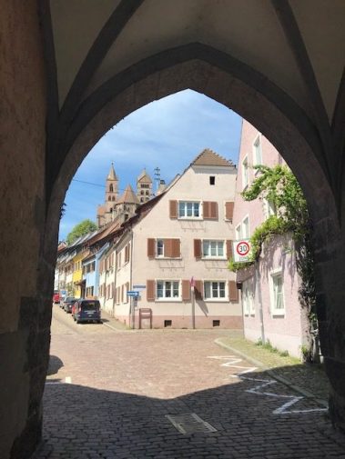 Wir schlendern weiter entlang der Kapuzinergasse bis zum Eingangstor des Franziskanerklosters und seinem Panoramagarten. Wunderschön angelegt mit Kräutern und Blumen durchschreiten wir die Grünanlage mit kleinen Kunstwerken und Sitzgelegenheiten und lassen uns natürlich den traumhaften Ausblick auf den Kaiserstuhl nicht entgehen.
