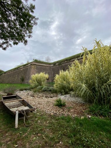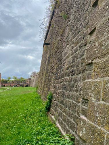 Neben der Kunst, ist natürlich auch die Architektur sehr spannend. Wir entdecken alte Tunnel, klettern auf die Außenwälle und bestaunen die Höhe der Mauern. Man kann sich hier lebhaft vorstellen, wie die Belagerungen über die Jahrhunderte hier stattgefunden haben und warum Neuf-Brisach nie eingenommen worden ist.