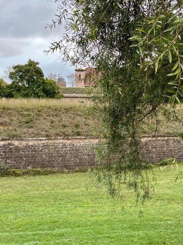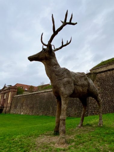 Die letzte von Vauban gestaltetet Stadt ist ein einziges großes Freilichtmuseum, welches wir nun entdecken. Wir verlassen den Marktplatz, laufen vorbei an der Sankt-Louis-Kirche und den symmetrisch gebauten Stadthäusern bis wir zum Wall kommen. Dort verlassen wir die Stadt durch das Porte de Strasbourg und betreten nach der Brücken die Wallgrabenanlage. Neben den imposanten Mauern und Wällen, sind in der ganzen Anlage diverse Kunstwerke ausgestellt, die kostenfrei besichtigt werden können – sozusagen ein Museum im Museum.