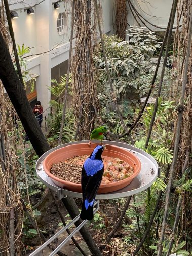 Auch das angrenzende Vogelhaus beeindruckt uns sehr. Obwohl wir Vögel nur bedingt spannend finden, fliegen die bunt gefiederten Tiere um uns herum. Auf drei Etagen (der Weg hinauf lohnt sich sehr) können wir ganz nah dabei sein und wissen manchmal nicht, wer hier wen beobachtet.