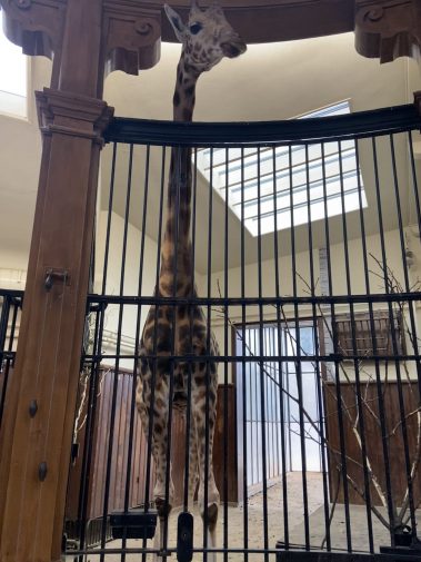 Am beeindruckendsten ist für uns das Giraffenhaus, denn durch den Regen sind meine Lieblingstiere im Innengehege und sehr neugierig, so dass sie mit den langen Hälsen über die Tore nur wenige Zentimeter von uns entfernt das Geschehen beobachten.